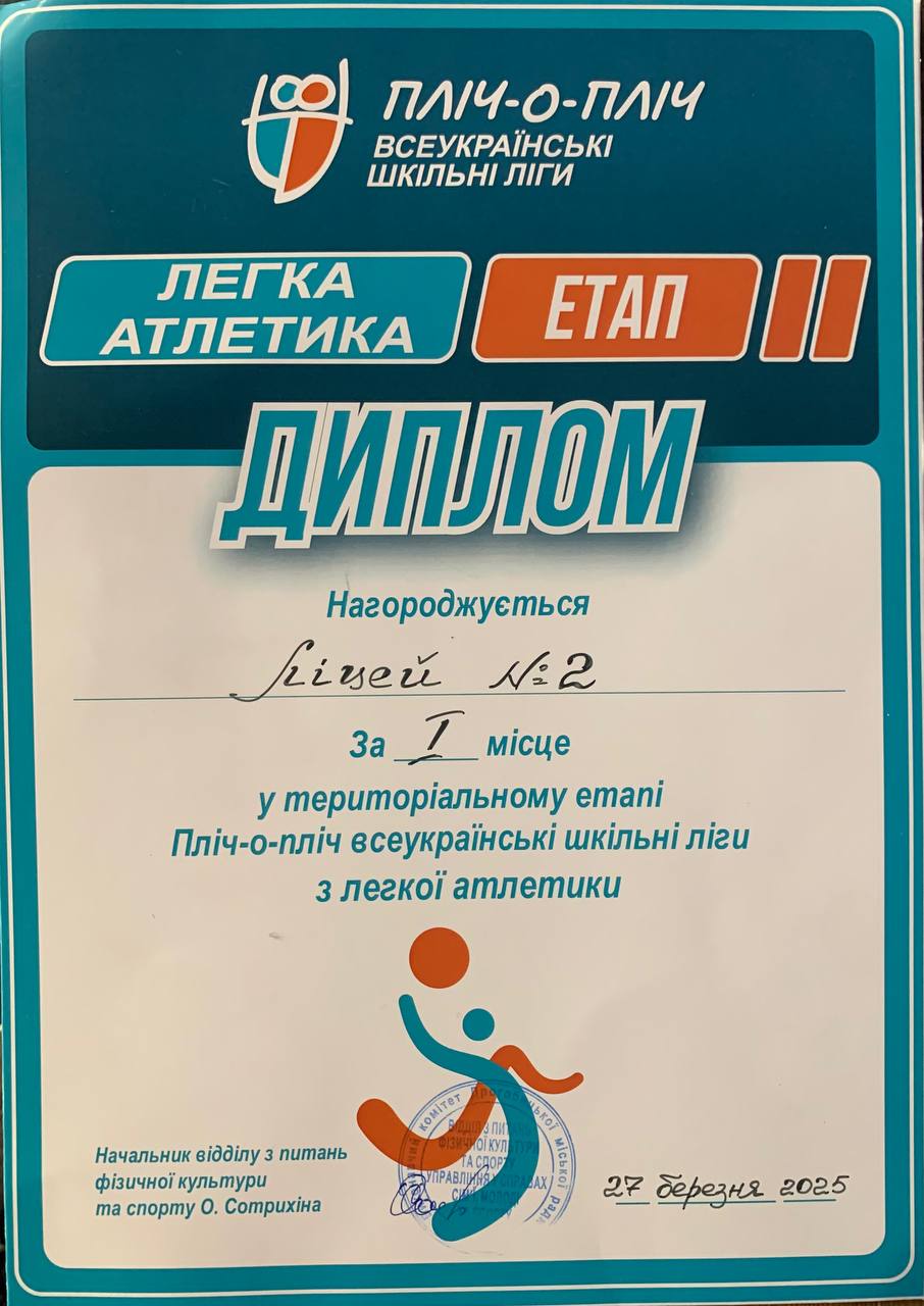 27 березня 2025 року в ДЮСШ ім. І. Боберського відбулися змагання територіального етапу всеукраїнських шкільних ліг Пліч-о-пліч із легкої атлетики серед учнів шостих - сьомих класів. Вітаємо команду ліцею №2, яка і на цей раз виборола перше місце (тренер – Михальцевич Р.В.)!