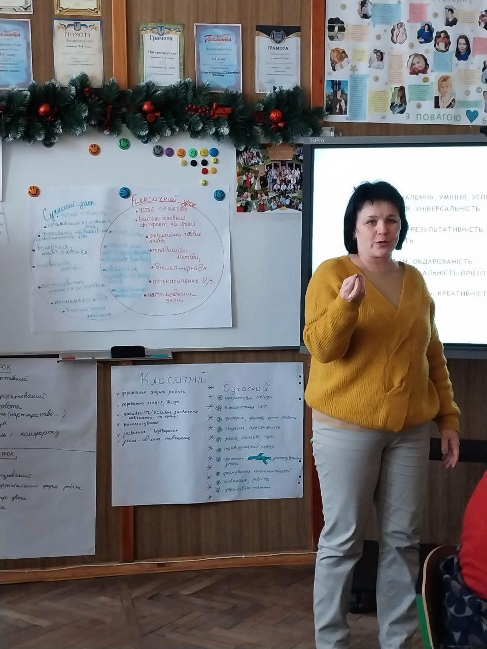 Кожен учитель хоче, щоб його учні добре вчилися, з інтересом і бажанням працювали на уроці. Батьки учнів також зацікавлені в цьому. Але іноді вчителям і батькам доводиться з жалем констатувати: «не хоче вчитися», «міг би чудово займатися, але не має бажання». І саме вчителі підбирали об’єктивні чинники, які впливають на ефективність уроку, характеризували всі аспекти ефективності, що залежать від учня та від учителя. Після виступів були доповнення та обговорення.