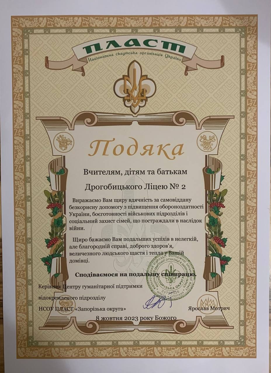 На допомогу Центру гуманітарної підтримки Національної скаутської організації України «Пласт» (Запорізька обл.) в ліцеї №2 було оголошено збір речей для діточок (0-18 р.) в зоні бойових дій. Дуже цінуємо роботу організації «Пласт» з дітьми, які зараз, як ніколи, потребують уваги та приділеного часу від дорослих. Дякуємо Вам!