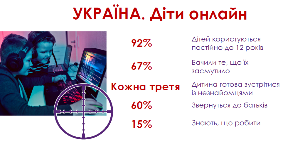 За даними різних міжнародних досліджень, лише 29% дітей повідомляють, що завжди почуваються безпечно онлайн. Щодо України, то 92% дітей до 12 років вже постійно користуються Інтернетом. 67% опитаних бачили в Інтернеті те, що їх засмучує. Кожна третя дитина готова зустрітися із незнайомцями і лише 15% дітей відповіли, що знають, як потрібно діяти в разі небезпеки.