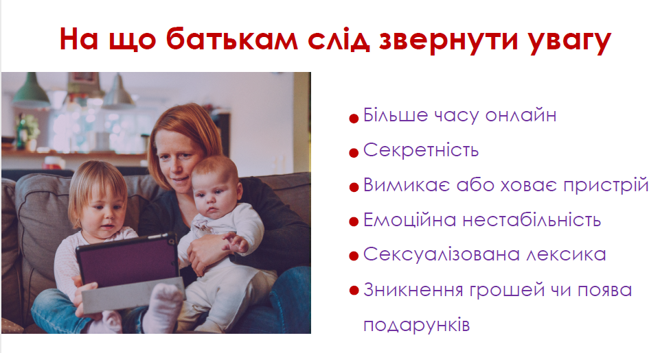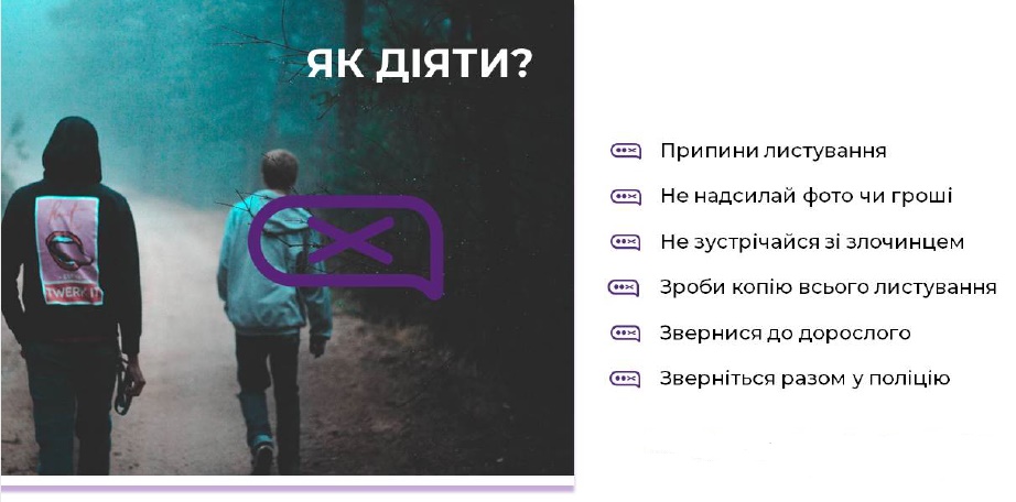 - онлайн-грумінг – налагодження довірливих стосунків із дитиною в Інтернеті з метою сексуального насильства;