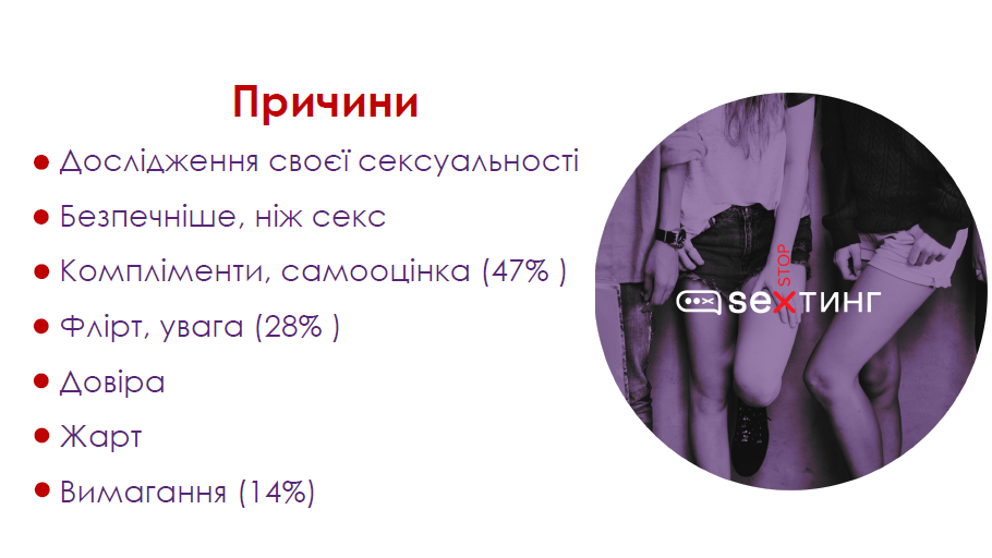- секстинг – надсилання інтимних фото/відео із використанням сучасних засобів зв’язку.
