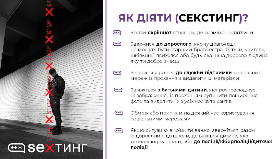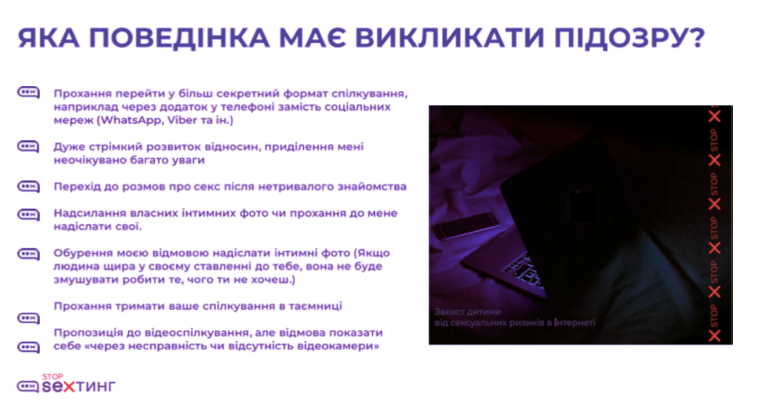- сексторшен – налагодження довірливих стосунків із дитиною в Інтернеті з метою отримання приватних матеріалів, шантажування та вимагання додаткових матеріалів чи грошей.